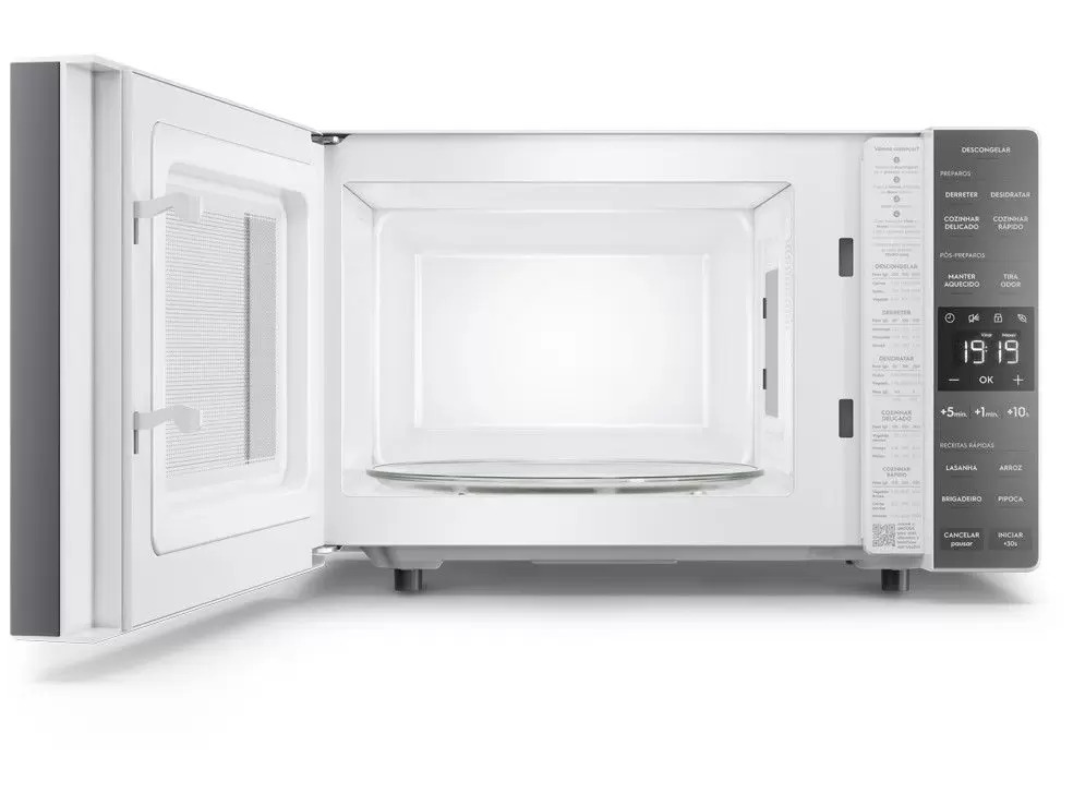 O micro-ondas Electrolux branco Efficient ME23B é pensado para facilitar sua rotina na cozinha. Ele conta com a tecnologia de descongelamento assistido para alcançar resultados mais uniformes ao descongelar os ingredientes, avisando no painel o momento certo de virar ou mexer os alimentos. Seu painel inteligente, com ajustes automáticos de potência, disponibiliza quatro modos de preparo diferentes e funcionais para tornar sua rotina mais prática: derreter, desidratar, cozinhar rápido e cozinhar delicado. Acione a Função Desidratar para fazer chips de frutas ou vegetais, além de desidratar ervas para conservá-las por mais tempo. Selecione a Função Cozinhar Delicado se quiser preparar alimentos macios, como peixes e alguns tipos de vegetais. Para vegetais mais duros e carne bovina, utilize a Função Cozinhar Rápido. Possui a Função Manter Aquecido, que conserva suas receitas recém preparadas quentes e deliciosas até o consumo. A função Tira Odor é ideal para manter seu produto livre de possíveis odores dos preparos anteriores graças ao sistema de recirculação do ar interno.