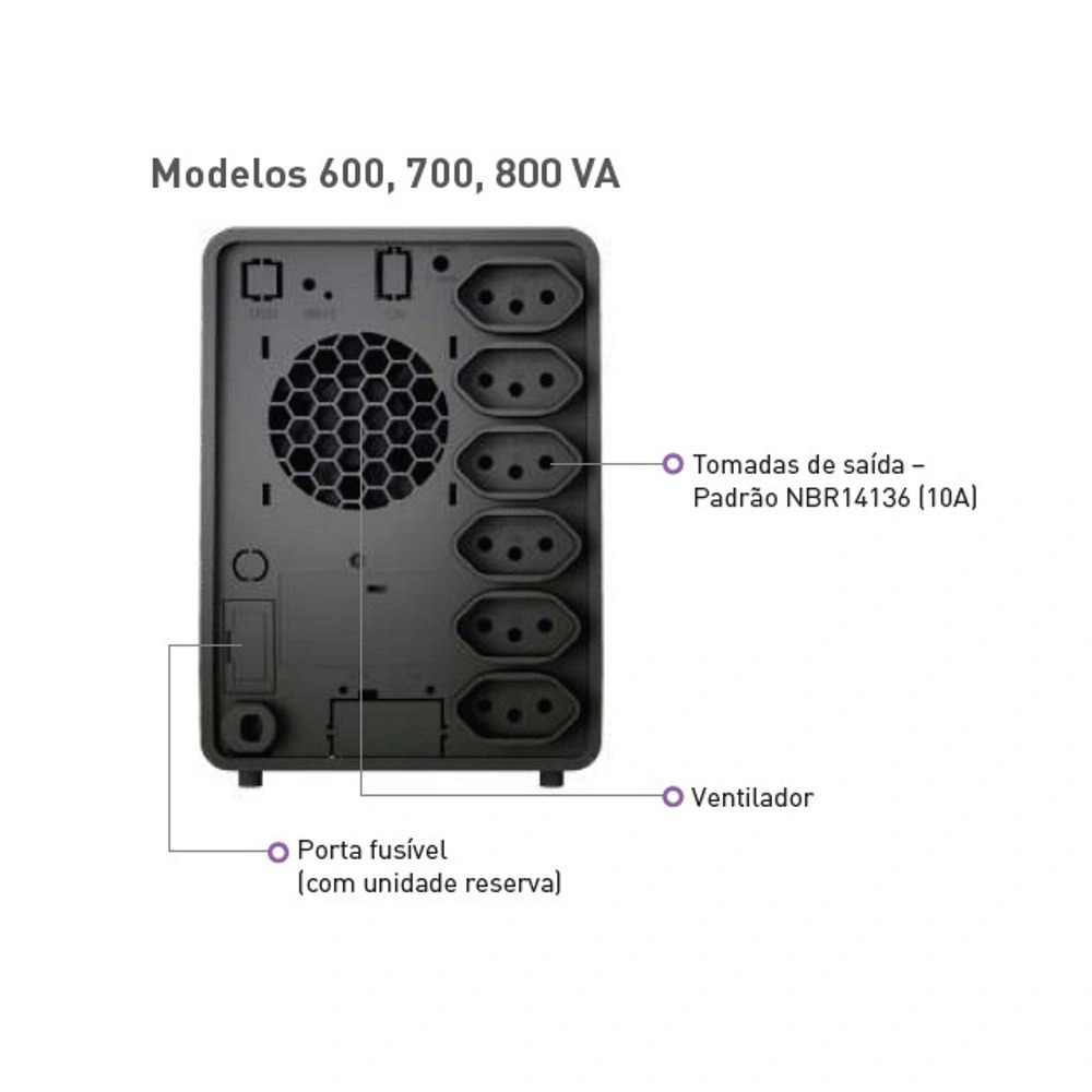 › Alarme audiovisual para queda de rede, subtensão, fim do tempo de autonomia, final de vida útil da bateria, sobretensão, potência excedida e sobretemperatura.
